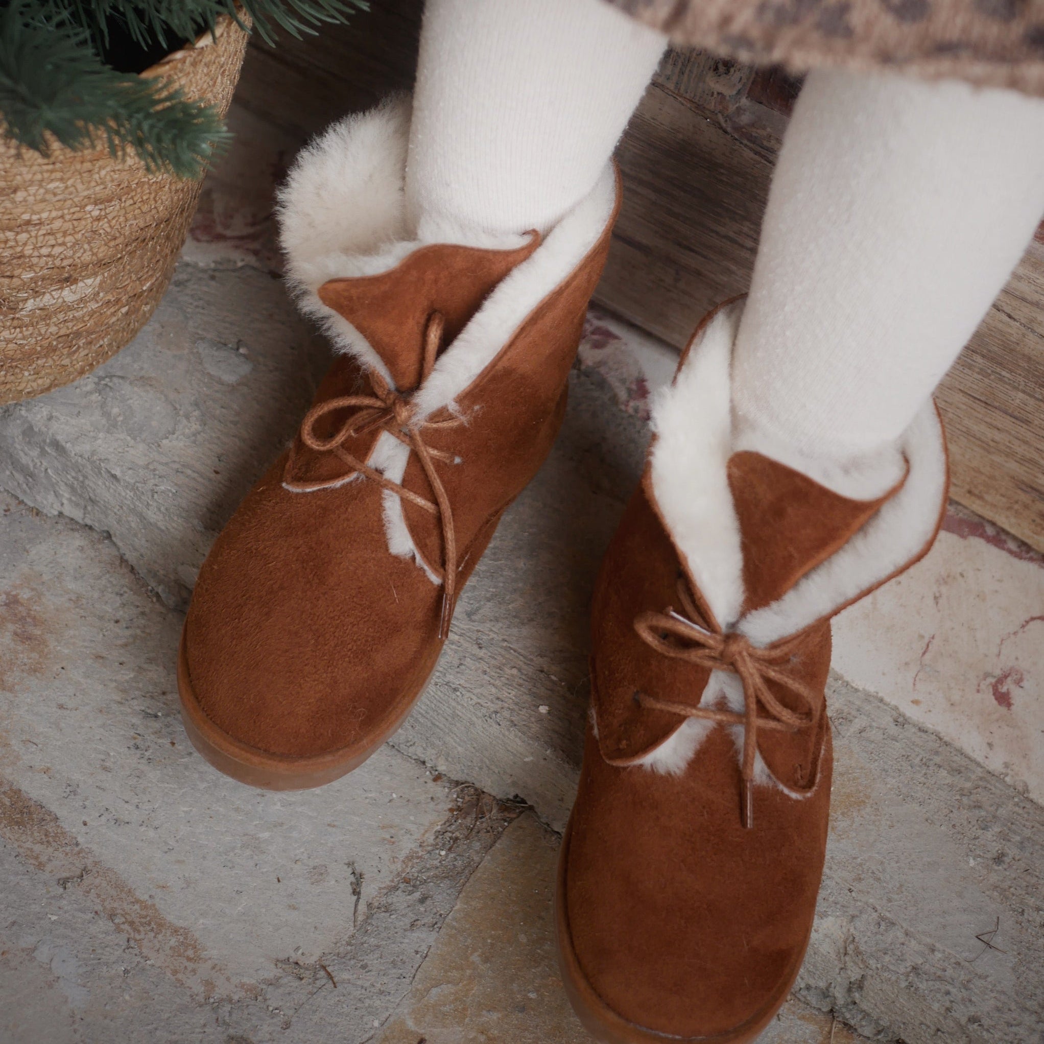 Just like our baby shoes, the junior shoes are made from 100% genuine sheepskin with natural heat-regulating properties – a soft, durable material that molds to your foot. The water-repellent finish also helps protect against light rain and moisture, so little adventures can continue even when the weather changes.