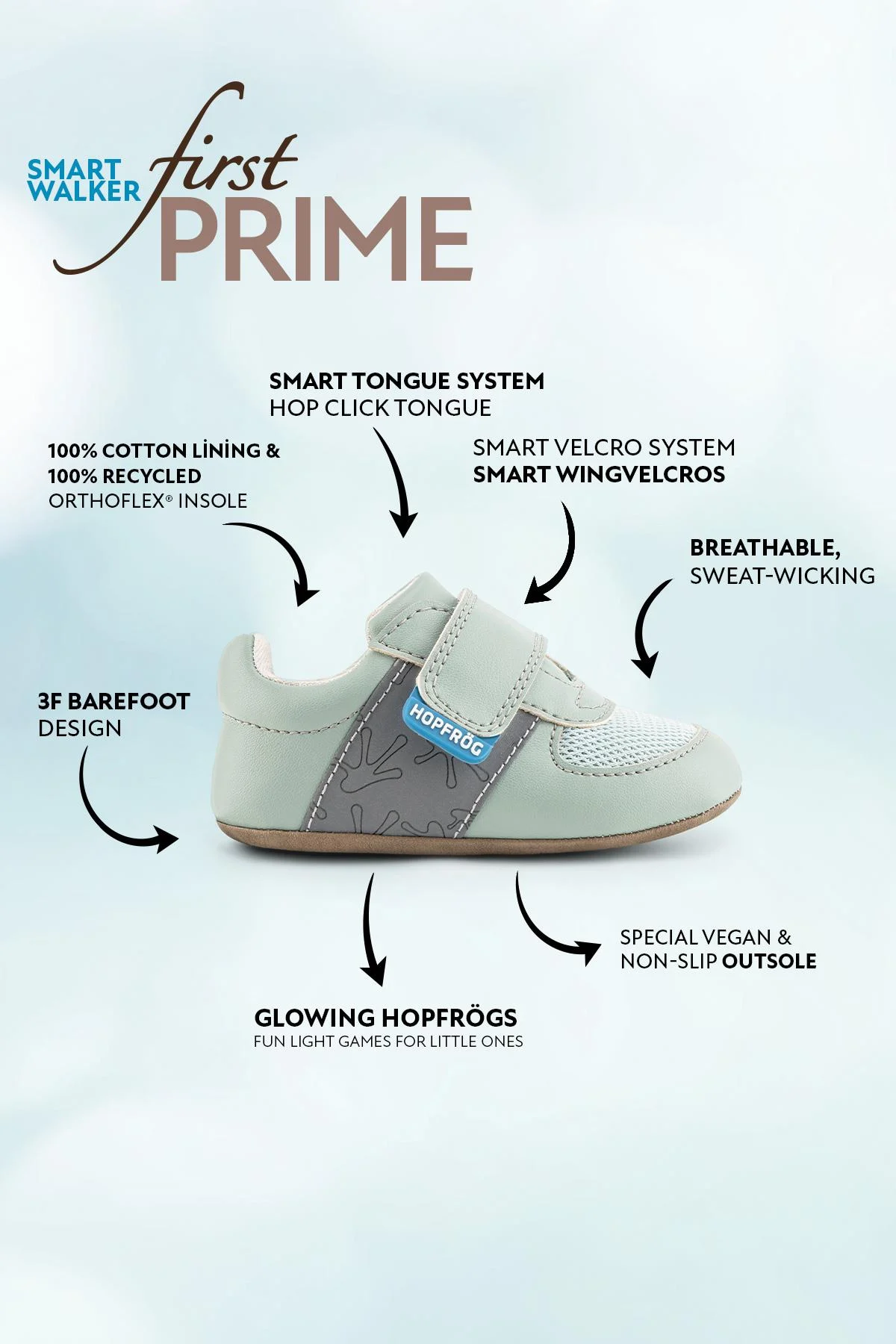 Utrustad med Hopfrögs innovativa Smart WingVelcros, kan även de minsta enkelt ta på och av skorna själva. Den elastiska och flexibla kardborren ger jämnt grepp utan att klämma, och håller skorna säkert på plats.